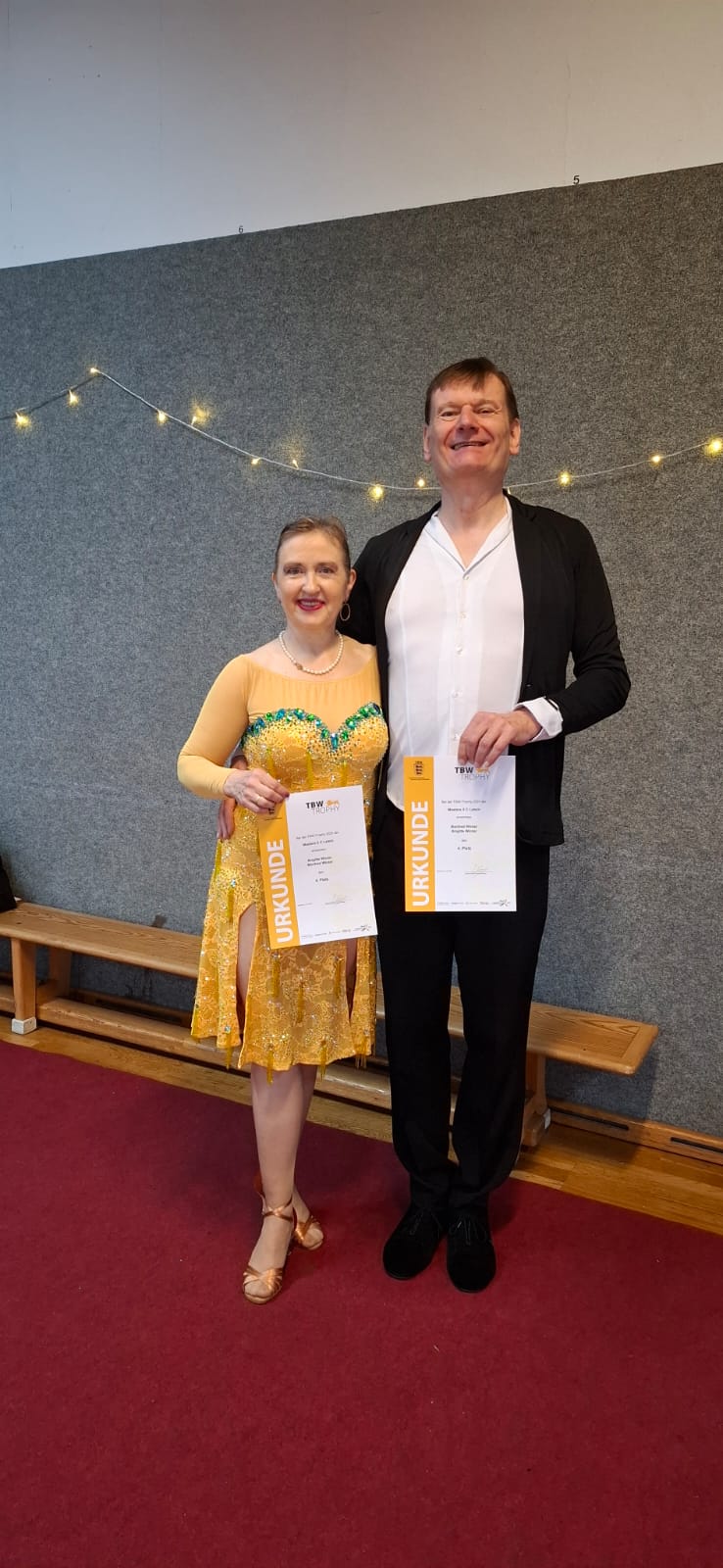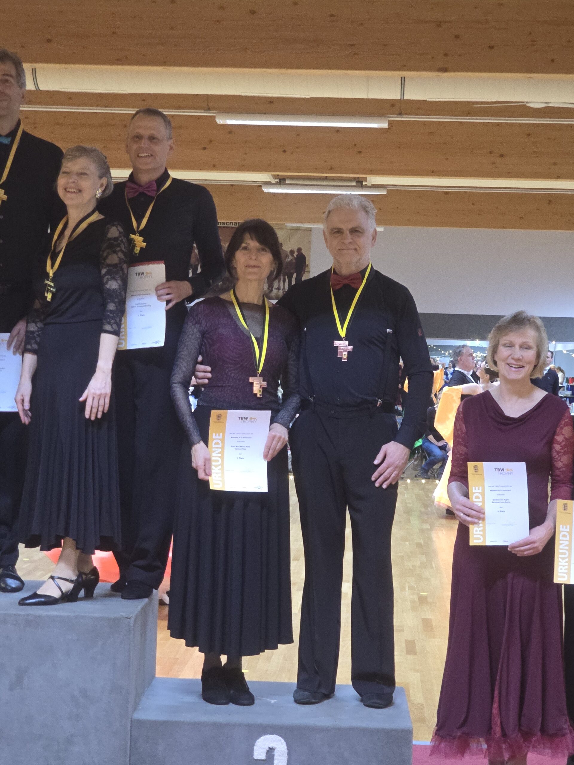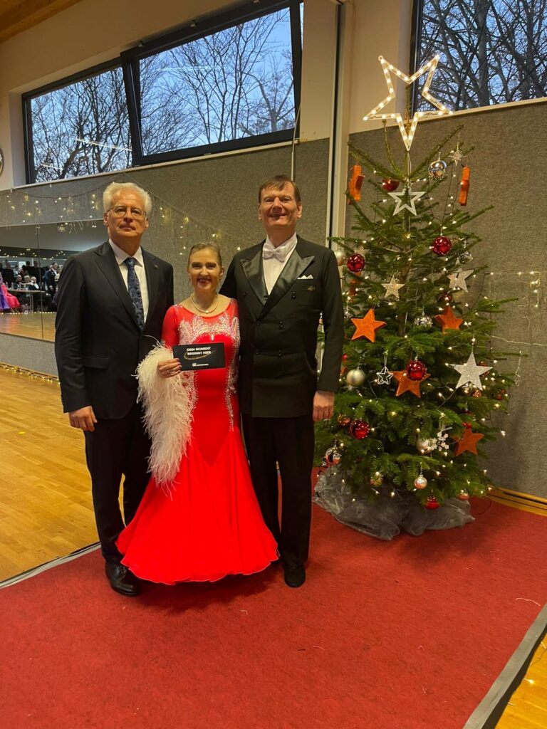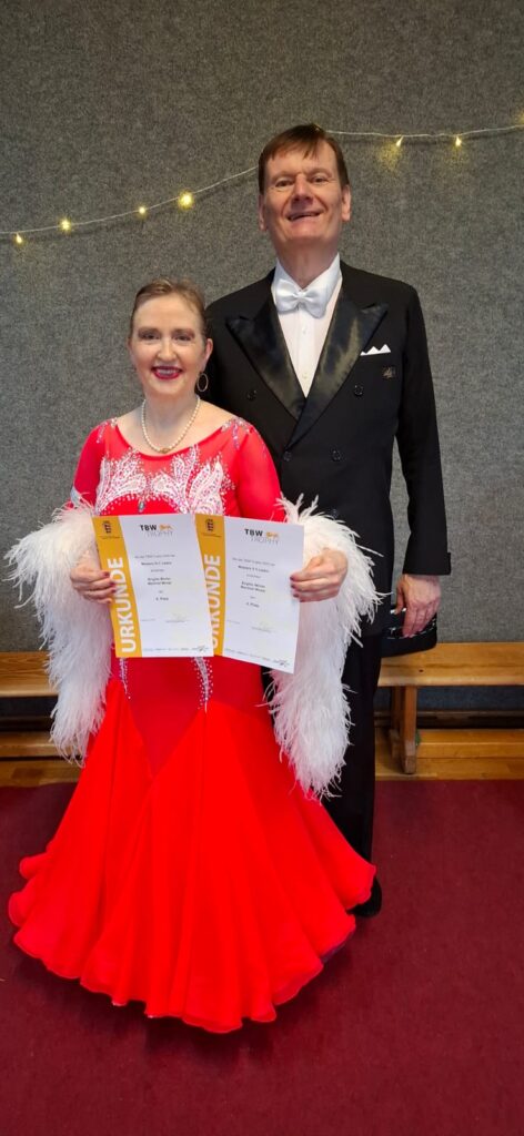 Axel und Carmen bestritten ihr erstes Turnier beim letzten Tanztag der diesjährigen TBW Trophy. Trotz Aufregung und kleinerer Patzer im Quickstep konnten sie sich in ihrer Kategorie (MAS III D Standard) auf dem Podest platzieren und den 3. Platz erreichen. Zu ihrer großen Überraschung wurden sie auch Drittplatzierte in der Gesamtwertung der Trophy 2025 und erhielten dafür die Trophy-Medaille, worüber sie sich natürlich sehr freuten.